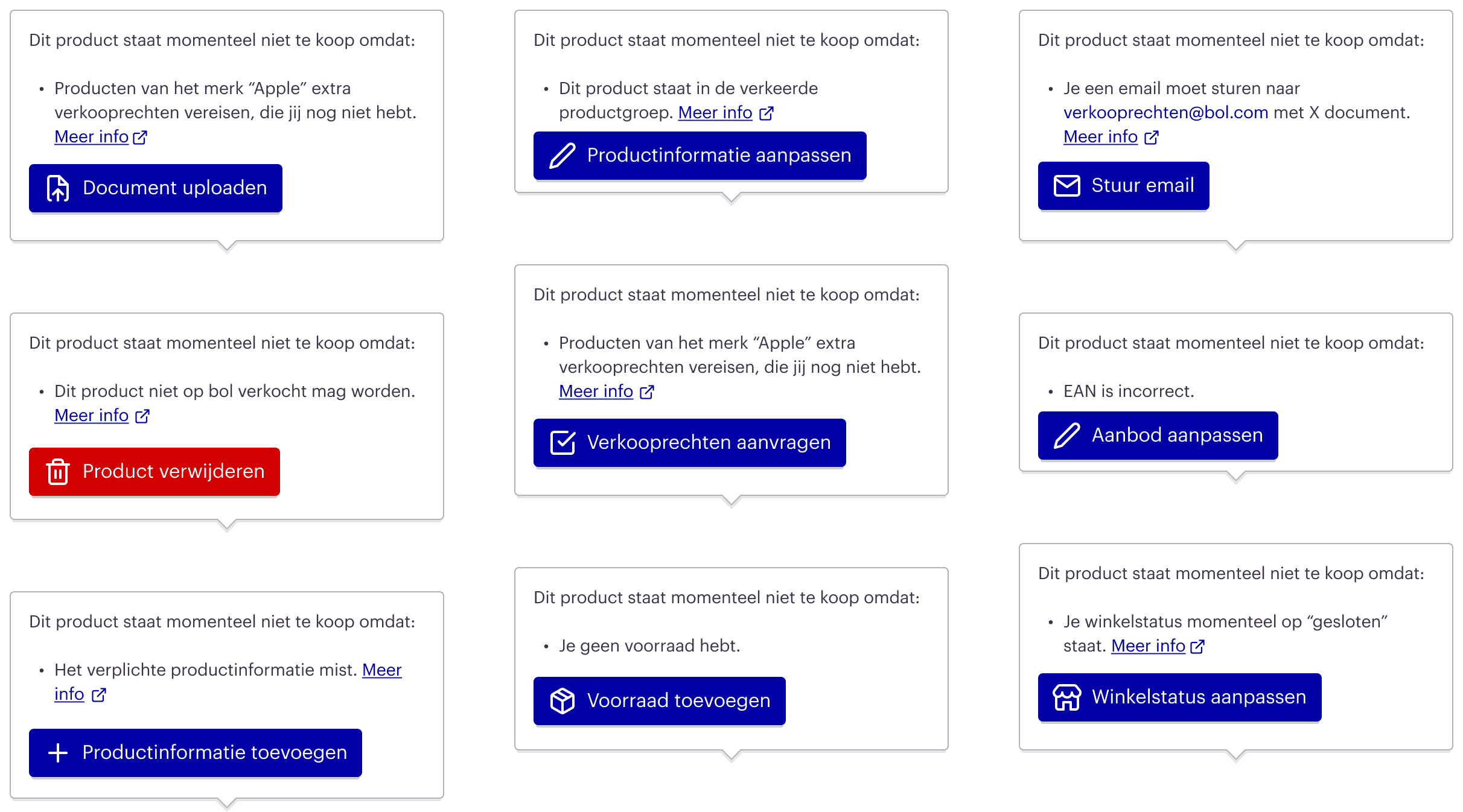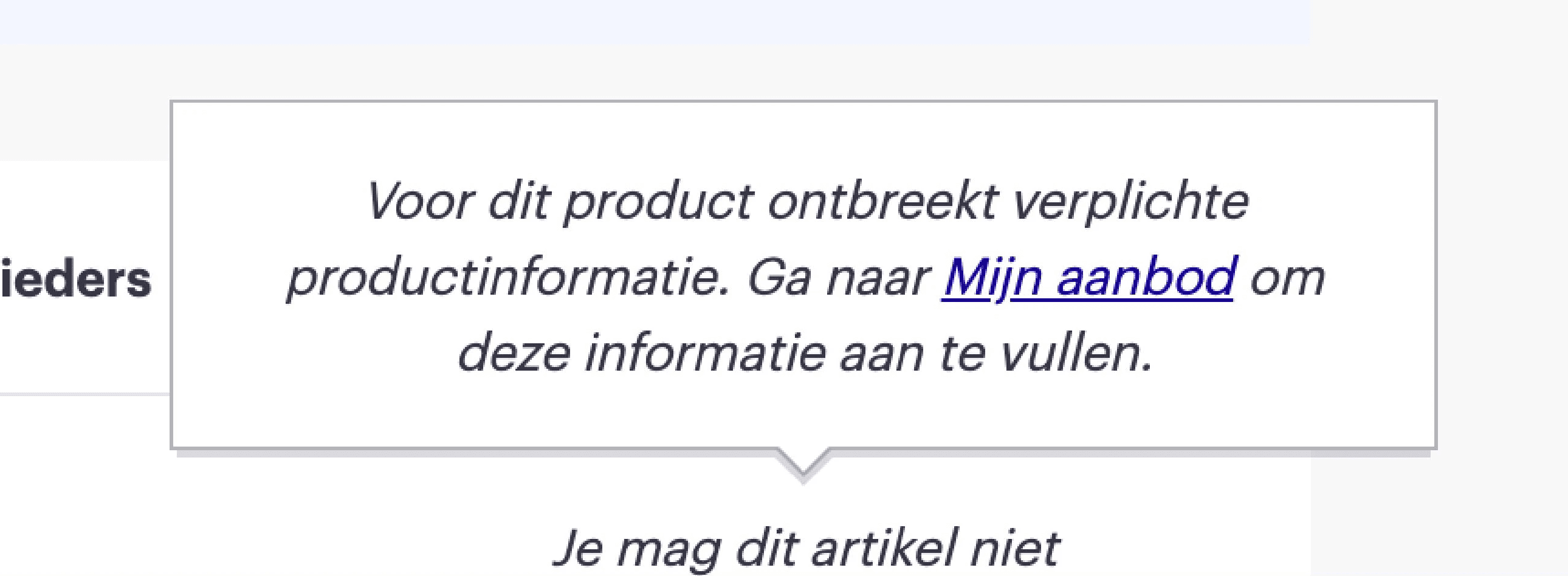 ℹ️ For example, we would communicate to the partner "For this product essential product information is missing. Go to ‘Mijn aanbod’ to enrich this product."